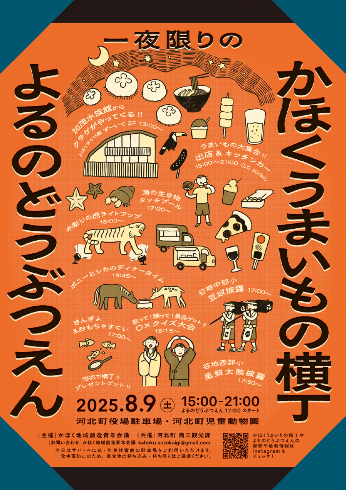 【2025年 かほくうまいもの横丁&よるのどうぶつえん】一夜限りの夏祭り! /* 基本スタイル */ body { font-family: 'M PLUS Rounded 1c', sans-serif; background-color: #fdfaf4 !important; color: #5d4037; font-size: 16px; line-height: 1.8; margin: 0; padding: 0; } a { color: #ff6f00; text-decoration: none; } a:hover { text-decoration: underline; } /* アニメーション */ .section-fade { opacity: 0; transform: translateY(20px); transition: opacity 0.8s ease-out, transform 0.8s ease-out; } .section-fade.visible { opacity: 1; transform: translateY(0); } /* 折りたたみ機能のデフォルトマーカーを非表示 */ summary { list-style: none; /* Safari, Firefox */ } summary::-webkit-details-marker { display: none; /* Chrome */ } { "@context": "https://schema.org", "@graph": [ { "@type": "Article", "mainEntityOfPage": { "@type": "WebPage", "@id": "https://yamagata-kouiki.info/log/?l=551003" }, "headline": "【2025年 かほくうまいもの横丁&よるのどうぶつえん】一夜限りの夏祭り!", "author": { "@type": "Organization", "name": "山形県のほっぺtourism" }, "publisher": { "@type": "Organization", "name": "山形県のほっぺtourism", "logo": { "@type": "ImageObject", "url": "https://hoppetourism.jp/logo.png" } }, "image": "https://yamagata-kouiki.info/wp/wp-content/uploads/2024/06/f0592e340c49cc3a3f01944517e4af55.jpeg", "datePublished": "2024-06-26T15:00:00+09:00", "dateModified": "2025-07-26T10:00:00+09:00" }, { "@type": "Event", "name": "かほくうまいもの横丁 よるのどうぶつえん", "url": "https://www.town.kahoku.yamagata.jp/soshiki/shoko/kankousinkou/3342/4558.html", "startDate": "2025-08-09T15:00:00+09:00", "endDate": "2025-08-09T21:00:00+09:00", "eventStatus": "https://schema.org/EventScheduled", "eventAttendanceMode": "https://schema.org/OfflineEventAttendanceMode", "isAccessibleForFree": true, "location": [ { "@type": "Place", "name": "河北町役場駐車場", "address": { "@type": "PostalAddress", "addressLocality": "河北町", "addressRegion": "山形県" }}, { "@type": "Place", "name": "河北町児童動物園", "address": { "@type": "PostalAddress", "addressLocality": "河北町", "addressRegion": "山形県" }}, { "@type": "Place", "name": "かほくまなび館 ずーいく", "address": { "@type": "PostalAddress", "addressLocality": "河北町", "addressRegion": "山形県" }} ], "image": [ "https://yamagata-kouiki.info/wp/wp-content/uploads/2024/06/f0592e340c49cc3a3f01944517e4af55.jpeg" ], "description": "河北町の夏の一大イベント!町内の絶品グルメが集う「うまいもの横丁」と、夜の動物園を探検する「よるのどうぶつえん」が同時開催!ステージイベントや楽しい企画が盛りだくさんの一夜です。", "organizer": { "@type": "Organization", "name": "かほく地域創造青年会議", "email": "kahoku.sozokaigi@gmail.com" } }, { "@type": "FAQPage", "mainEntity": [ { "@type": "Question", "name": "駐車場はありますか?", "acceptedAnswer": { "@type": "Answer", "text": "はい、会場周辺に臨時駐車場が用意される予定です。詳細は河北町の公式サイトやイベントのInstagramでご確認ください。混雑が予想されるため、公共交通機関のご利用や乗り合わせにご協力ください。" } }, { "@type": "Question", "name": "雨が降っても開催しますか?", "acceptedAnswer": { "@type": "Answer", "text": "小雨決行の予定ですが、荒天の場合は中止や内容が変更になる可能性があります。開催に関する最新情報は、かほく地域創造青年会議のInstagramアカウント(@kahoku.sozokaigi)でご確認ください。" } }, { "@type": "Question", "name": "会場での支払いは現金のみですか?", "acceptedAnswer": { "@type": "Answer", "text": "はい、会場内のお買い物は「現金のみ」となる予定です。事前に現金をご用意いただくとスムーズです。" } } ] } ] } document.addEventListener("DOMContentLoaded", () => { const sections = document.querySelectorAll(".section-fade"); const observer = new IntersectionObserver( entries => { entries.forEach(entry => { if (entry.isIntersecting) { entry.target.classList.add("visible"); observer.unobserve(entry.target); } }); }, { threshold: 0.1 } ); sections.forEach(section => { observer.observe(section); }); }); 一夜限りの夏祭り! かほくうまいもの横丁&よるのどうぶつえん 河北町の夏が、今年も熱くなる! 町内の絶品グルメが集う「うまいもの横丁」と、夜の動物園を探検できる「よるのどうぶつえん」が今年も同時開催! 一日だけの特別な夜を、家族や友達とめいっぱい楽しもう! イベント基本情報 日時: 2025年8月9日(土) 15:00〜21:00 場所: 河北町役場駐車場 / 河北町児童動物園 うまいもの横丁 町内のお店自慢のグルメや、この日だけの限定メニューがずらり!冷たいビールやジュースを片手に、河北町の「うまい!」を心ゆくまで堪能してください。お支払いは現金のみなのでお忘れなく! ▼ クリックして出店者一覧を見る かほく地域創造青年会議 河北町商工会青年部 河北39会 かほくらし社&谷地高 かほく冷たい肉そば研究会 河北町観光物産協会 河北町べに花の里振興公社 正福 大和屋 ぬーぼうチャウチャウ 居酒屋さんごっこ yummy 米沢ジャックスブルワリー WayWayクレープ クダモノラクエンクロッキオ クラッカー 一咲(他多数) よるのどうぶつえん 普段は見られない夜の動物たちの姿をのぞいてみよう!今年はなんと、鶴岡市立加茂水族館からクラゲがやってきます!(展示場所は「かほくまなび館 ずーいく2階」です。)恒例の金魚すくいや、海の生き物タッチプールなど、子ども