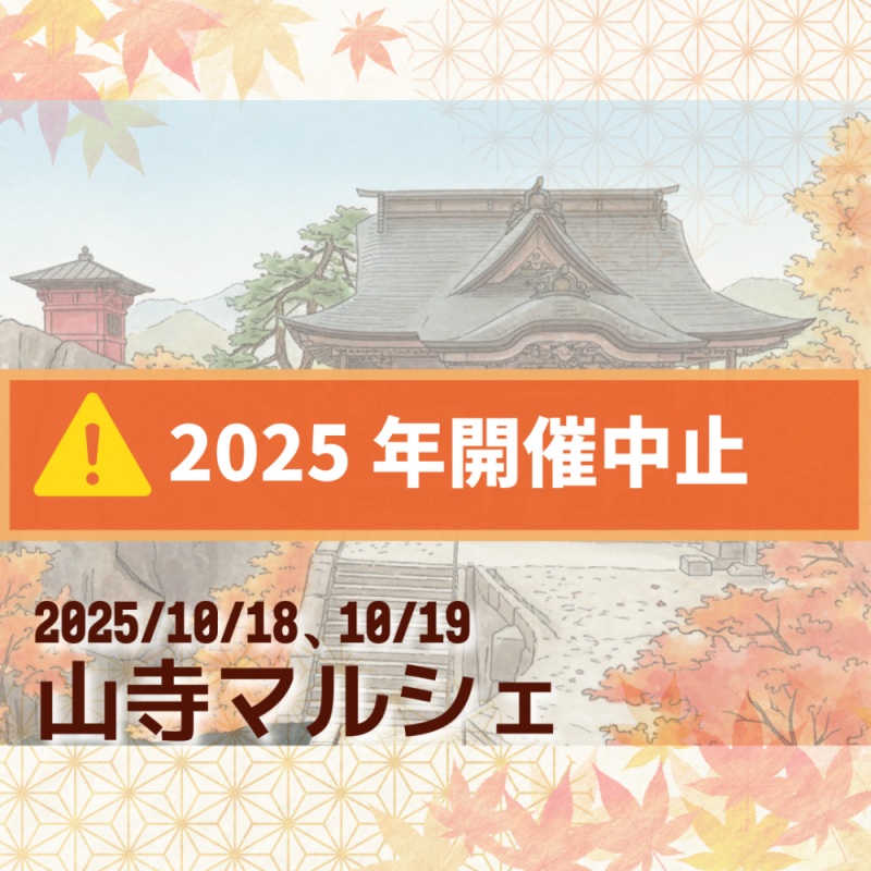 開催中止のお知らせ10月18日(土)・19日(日)に予定しておりました「歩行者天国・山寺マルシェ」は、諸般の事情により、中止とさせていただく事になりました。以下は、当初予定されていたイベント内容の記録です。 秋色に染まる山寺で、特別な2日間山形が誇る絶景スポット「山寺」が一年で最も美しく彩られる季節。普段は車が行き交う門前町を、自分のペースでゆったりと散策できる特別なチャンスとして企画されました。心地よい秋風を感じながら、美味しいグルメや素敵な手作り品が集まるマルシェを巡り、最高の思い出をつくるイベントとなる予定でした。 当初のイベント予定 開催予定日時令和7年10月18日(土)・19日(日)歩行者天国: 9:00〜16:00山寺マルシェ: 9:30〜15:00 開催予定場所山寺門前町一帯 {"@context":"https://schema.org","@graph":[{"@type":"Article","mainEntityOfPage":{"@type":"WebPage","@id":"(この記事のURLを貼り付けてください)"},"headline":"【中止のお知らせ】山寺門前町歩行者天国・山寺マルシェ(2025年10月)","author":{"@type":"Organization","name":"山形県のほっぺtourism"},"publisher":{"@type":"Organization","name":"山形県のほっぺtourism"},"image":{"@type":"ImageObject","url":"(管理画面で設定した画像のURL)"},"datePublished":"2025-09-17T04:00:00+09:00","dateModified":"2025-10-01T00:00:00+09:00","description":"【開催中止】2025年10月18日・19日に予定されていた「歩行者天国・山寺マルシェ」は中止となりました。本記事では当初予定されていたイベント内容を記録として掲載しています。","about":{"@type":"Event","name":"山寺門前町歩行者天国・山寺マルシェ","startDate":"2025-10-18T09:00:00+09:00","endDate":"2025-10-19T16:00:00+09:00","eventStatus":"https://schema.org/EventCancelled","eventAttendanceMode":"https://schema.org/OfflineEventAttendanceMode","location":{"@type":"Place","name":"山寺門前町","address":{"@type":"PostalAddress","addressLocality":"山形市","addressRegion":"山形県","streetAddress":"山寺","addressCountry":"JP"}},"description":"2025年10月18日・19日の2日間、山寺門前町が歩行者天国となり、グルメや雑貨が集まるマルシェが開催される予定でした。","organizer":{"@type":"Organization","name":"山寺観光協会","url":"https://www.yamaderakankou.com/"}}}]}