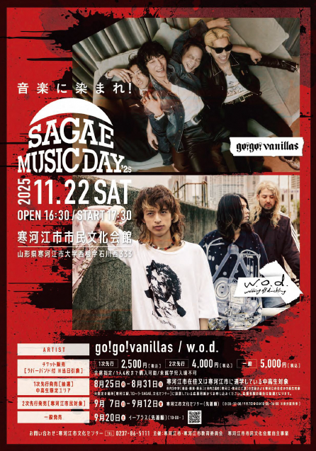 音楽に染まれ!「SAGAE MUSIC DAY'25」開催!2025年11月22日(土)、寒河江市市民文化会館にて、若者向けの音楽イベント「SAGAE MUSIC DAY'25」が開催されます!今年のステージを熱く盛り上げるのは、絶大な人気を誇るロックバンド「go!go!vanillas」と、圧倒的なオリジナリティでファンを魅了する「w.o.d.」の2組です。パワフルで魂を揺さぶるライブパフォーマンスは必見!寒河江の秋を音楽で熱く染め上げましょう! イベント概要 開催日:2025年11月22日(土) 時間:OPEN 16:30 / START 17:30 会場:寒河江市市民文化会館 出演:go!go!vanillas / w.o.d. 出演アーティストgo!go!vanillas牧達弥(vo/g)、柳沢進太郎(g)、長谷川プリティ敬祐(ba)、ジェットセイヤ(dr)からなる4ピース・バンド。 2013年のデビュー以降、様々なジャンルを貪欲に取り込みながらサウンドをアップデートし続けてきた。 音楽ルーツへの深いリスペクトと、変化を恐れない柔軟なクロスオーバーのスピリットで生み出される楽曲は多くのリスナーを魅了している。公式サイト w.o.d.サイトウタクヤ(Vo&Gt)、Ken Mackay(Bass)、中島元良(Drums)からなる神戸発の3ピースバンド。 時に感情的にシャウトするボーカルと歪んだギター、ヘヴィなベース、抜群のビートが息づくドラムスが織りなすネオ・グランジ・サウンドが特徴。 圧倒的な音楽センスとライブパフォーマンスで類い稀なオリジナリティを見せつける。公式サイト チケット情報チケットは全席指定で、記念のラバーバンド付(※当日引換)です。お一人様4枚まで購入可能。未就学児は入場不可となります。1次先行発売 [抽選] 中高生限定 料金:2,500円 (税込) 期間:8月25日(月) 〜 8月31日(日) 対象:寒河江市在住または市内に通学している中高生 申込:寒河江駅、フローラ・SAGAE、文化センター設置の応募用紙からお申し込みください。 ※応募多数の場合は抽選となります。 2次先行発売 [先着] 寒河江市民対象 料金:4,000円 (税込) 期間:9月7日(日) 〜 9月12日(金) 場所:寒河江市文化センター ※8:30-17:00 (9/7のみ10:00-16:00)。身分証をご持参ください。 一般発売 [先着] 料金:5,000円 (税込) 開始:9月20日(土) 10:00〜 場所:イープラス 会場アクセス寒河江市市民文化会館山形県寒河江市大字西根字石川西333 JR寒河江駅から自動車で約7分 JR寒河江駅から徒歩で約35分 当日は会場駐車場と臨時駐車場が利用できます。 ※満車になる可能性もございますので、ご了承ください。 Q&AQ1. チケットはどこで買えますか? A1. 1次先行(中高生対象)と2次先行(寒河江市民対象)は指定の場所での申し込み・販売となります。一般発売は9月20日(土)10:00から「イープラス」にて販売されます。Q2. 小さな子供も入場できますか? A2. 申し訳ございませんが、未就学児の入場はできません。Q3. 当日券はありますか? A3. 前売券が完売した場合、当日券の販売はありません。 お早めに前売券をお買い求めください。 お問い合わせ寒河江市文化センター 0237-86-5111最新情報は公式SNSをチェック! body{font-family: 'Noto Sans JP', sans-serif;}details[open] summary .fa-chevron-down {transform: rotate(180deg);} {"@context":"https://schema.org","@graph":[{"@type":"Event","name":"SAGAE MUSIC DAY'25","startDate":"2025-11-22T17:30:00+09:00","endDate":"2025-11-22T20:00:00+09:00","doorTime":"16:30:00+09:00","eventAttendanceMode":"https://schema.org/OfflineEventAttendanceMode","eventStatus":"https://schema.org/EventScheduled","location":{"@type":"Place","name":"寒河江市市民文化会館","address":{"@type":"PostalAddress","streetAddress":"大字西根字石川西333","addressLocality":"寒河江市","addressRegion":"山形県","postalCode":"991-0003","addressCountry":"JP"}},"image":["https://yamagata-kouiki.info/wp-content/uploads/2023/09/sample-image.jpg"],"description":"2025年11月22日に山形県寒河江市で開催される音楽イベント。出演はgo!go!vanillasとw.o.d.。","performer":[{"@type":"MusicGroup","name":"go!go!vanillas"},{"@type":"MusicGroup","name":"w.o.d."}],"organizer":{"@type":"Organization","name":"寒河江市・寒河江市教育委員会"},"offers":[{"@type":"Offer","url":"https://eplus.jp/","price":"5000","priceCurrency":"JPY","availability":"https://schema.org/InStock","validFrom":"2025-09-20T10:00:00+09:00","name":"一般発売"},{"@type":"Offer","price":"4000","priceCurrency":"JPY","availability":"https://schema.org/InStock","validFrom":"2025-09-07T08:30:00+09:00","validThrough":"2025-09-12T17:00:00+09:00","name":"2次先行発売 (寒河江市民対象)"},{"@type":"Offer","price":"2500","priceCurrency":"JPY","availability":"https://schema.org/InStock","validFrom":"2025-08-25T00:00:00+09:00","validThrough":"2025-08-31T23:59:59+09:00","name":"1次先行発売 (中高生限定)"}]},{"@type":"Article","mainEntityOfPage":{"@type":"WebPage","@id":"https://yamagata-kouiki.info/archives/event/sagae-music-day-25"},"headline":"【SAGAE MUSIC DAY'25】go!go!vanillasとw.o.d.が寒河江に集結!チケット・アクセス情報完全ガイド","author":{"@type":"Organization","name":"山形県のほっぺtourism"},"publisher":{"@type":"Organization","name":"山形県のほっぺtourism","logo":{"@type":"ImageObject","url":"https://yamagata-kouiki.info/wp-content/themes/ysite/assets/img/logo.svg"}},"datePublished":"2025-07-26","dateModified":"2025-07-26","description":"2025年11月22日、山形県寒河江市の市民文化会館で「SAGAE MUSIC DAY'25」開催!go!go!vanillasとw.o.d.の熱いライブを体感