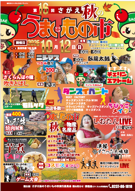 さがえの秋の味覚が大集結!食欲の秋、芸術の秋、スポーツの秋!寒河江の魅力がギュッと詰まった一日を楽しもう!2025年10月12日(日)、道の駅寒河江チェリーランド河川敷公園にて「第16回 さがえ秋のうまいもの市」が開催されます。山形牛の焼肉試食や旬の味覚が味わえる芋煮フェアをはじめ、ニジマスのつかみ取り、大迫力のステージイベントなど、子どもから大人まで一日中楽しめるコンテンツが盛りだくさん!この記事では、イベントの魅力を余すことなくお伝えする完全ガイドをお届けします。お出かけ前にチェックして、さがえの秋を満喫しましょう! イベント概要 開催日時 2025年10月12日(日) 10:00〜15:00 会場 道の駅 寒河江 チェリーランド河川敷公園 山形県寒河江市大字八鍬字川原919-6 入場料 無料(一部有料イベントあり) 主催 さがえ秋のうまいもの市実行委員会 お問い合わせ 事務局(さくらんぼ会館内) 0237-86-1818 食欲の秋!絶品グルメを堪能しよう限定400食!山形牛焼肉試食なんといっても見逃せないのが、限定400食で振る舞われる「山形牛焼肉試食」です!山形が誇るブランド牛の、とろけるような旨味を無料で味わえる絶好のチャンス。11:00から開始なので、早めに並ぶのがおすすめです!秋の風物詩!芋煮FAIR山形の秋といえばやっぱり芋煮!「芋煮FAIR」では、里芋や牛肉、ネギなどをたっぷり使った、心も体も温まる伝統の味を楽しめます。秋空の下で味わう芋煮は格別です。うまいもの市の秋の物産名産品会場には多数の出店があり、地元の新鮮な農産物や海鮮焼き、懐かしいばくだん菓子など、さがえの"うまいもの"が大集合!伝統野菜のPRコーナーもあり、新たな美味しさに出会えるかもしれません。 家族で楽しむ!体験イベント ニジマスつかみ取り (12:30〜) 子どもたちに大人気のニジマスつかみ取り!元気に泳ぎ回るニジマスを捕まえる貴重な体験ができます。 ミニさくらんぼの種吹きとばし (@10:40〜 A13:30〜) 寒河江ならではのユニークなイベント!誰が一番遠くまで飛ばせるか、家族や友達と競い合ってみてはいかがでしょうか。 フィンランド発祥スポーツ「モルック」 簡単なルールで誰でも楽しめるニュースポーツ「モルック」の体験コーナーも! チェリンエアドーム&ゲーム大会 子どもたちが思いっきり体を動かして遊べるチェリンのエアドームや、豪華景品が当たるかもしれないゲーム大会(13:00〜)も開催されます。 芸術の秋!華やかなステージイベントオープニングを飾る勇壮な「臥龍太鼓」から、寒河江市出身のユーチューバー「しおたん」のLIVE、津軽すこっぷ三味線、地元小学校のマーチングバンドまで、多彩なステージがイベントを盛り上げます! 10:00〜 臥龍太鼓 (オープニング) 12:00〜 しおたん LIVE 津軽すこっぷ三味線 LIVE 寒河江中部小学校 マーチングバンド LIVE ダンスイベント (BEAT FACTORY ほか) 同時開催!コスモスまつりうまいもの市とあわせて「コスモスまつり」も楽しめます。河川敷に広がる色とりどりのコスモス畑は絶好の写真スポット。コスモスアートを眺めながらのんびり散策するのもおすすめです。秋の心地よい風を感じながら、美しい花々に癒されてください。 よくある質問 (FAQ)Q駐車場はありますか?Aはい、会場の道の駅寒河江チェリーランドに隣接する河川敷に駐車場が用意されています。当日は混雑が予想されますので、お時間に余裕をもってお越しいただくか、乗り合わせでのご来場にご協力ください。Q雨天の場合は中止ですか?A荒天により、内容の一部が変更となる場合がございます。最新情報は公式サイト等でご確認いただくか、主催者までお問い合わせください。Qペットを連れて入場できますか?A屋外イベントのため同伴は可能と思われますが、多くの方が来場されますので、リードの着用や糞尿の処理など、マナーを守って他のお客様へのご配慮をお願いいたします。建物内への入場はご遠慮ください。 { "@context": "https://schema.org", "@graph": [ { "@type": "Event", "name": "第16回 さがえ秋のうまいもの市", "startDate": "2025-10-12T10:00:00+09:00", "endDate": "2025-10-12T15:00:00+09:00", "eventAttendanceMode": "https://schema.org/OfflineEventAttendanceMode", "eventStatus": "https://schema.org/EventScheduled", "location": { "@type": "Place", "name": "道の駅 寒河江 チェリーランド河川敷公園", "address": { "@type": "PostalAddress", "streetAddress": "大字八鍬字川原919-6", "addressLocality": "寒河江市", "addressRegion": "山形県", "postalCode": "991-0041", "addressCountry": "JP" } }, "image": [ "https://yamagata-kouiki.info/wp/wp-content/uploads/2023/10/photo_2023-10-12_11-00-53.jpg" ], "description": "山形牛の焼肉試食や芋煮フェア、ニジマスのつかみ取りなど、寒河江の秋の味覚と楽しみが満載のイベントです。ステージイベントやコスモスまつりも同時開催され、家族みんなで一日中楽しめます。", "offers": { "@type": "Offer", "url": "https://yamagata-kouiki.info/", "price": "0", "priceCurrency": "JPY", "availability": "https://schema.org/InStock", "validFrom": "2025-10-12T00:00" }, "performer": [ { "@type": "PerformingGroup", "name": "臥龍太鼓" }, { "@type": "Person", "name": "しお