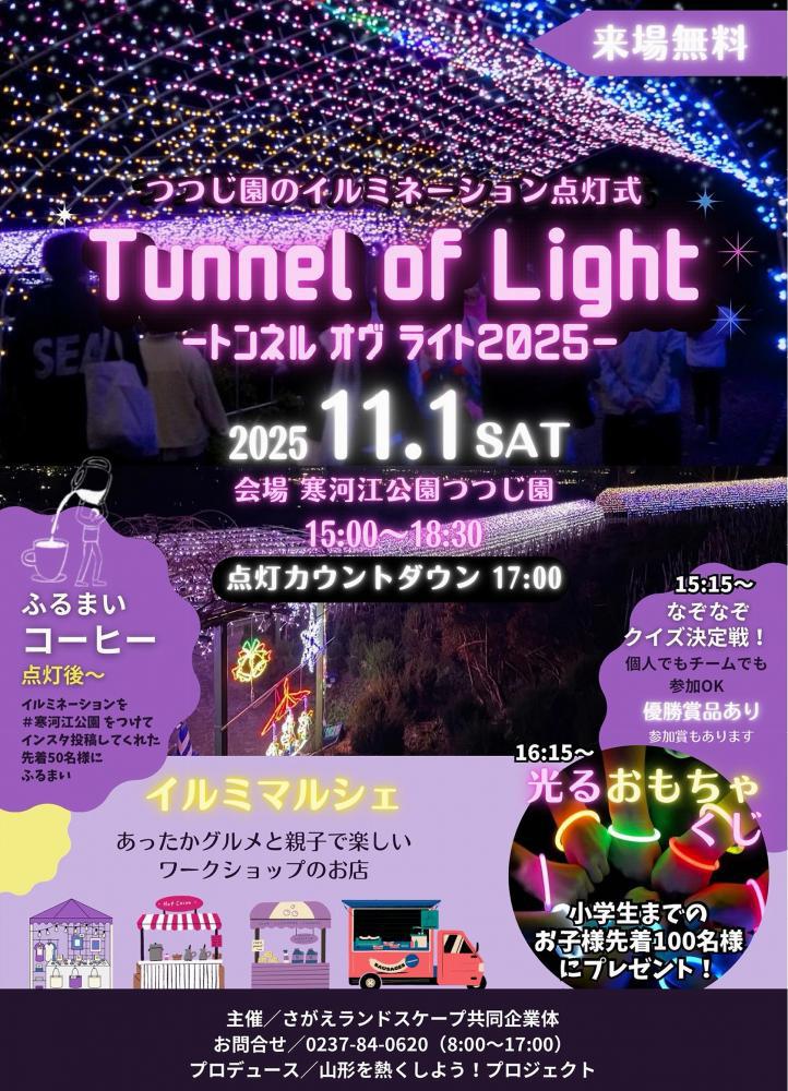 寒河江市の夜空を彩る幻想的な光の祭典が今年もやってきます!2025年11月1日(土)、寒河江公園つつじ園にて、イルミネーションイベント「Tunnel of Light 2025」の点灯式が開催されます。入場は無料で、美しい光のトンネルはもちろん、心も体も温まるグルメやワークショップ、お子様が喜ぶプレゼント企画など、家族みんなで楽しめるコンテンツが盛りだくさん。秋の夜長、大切な人と一緒に心温まるひとときを過ごしませんか? イベント概要 イベント名 つつじ園のイルミネーション点灯式 Tunnel of Light 2025(トンネル オブ ライト 2025) 開催日時 2025年11月1日(土) 15:00〜18:30 ※点灯カウントダウン:17:00〜 会場 寒河江公園 つつじ園 (住所: 山形県寒河江市長岡) 料金 入場無料 主催・問合せ さがえランドスケープ共同企業体 電話: 0237-84-0620 (受付時間 8:00〜17:00) イベントの見どころ・催し物 イルミマルシェ心も体も温まるグルメや、親子で参加できる楽しいワークショップのお店が並びます。イルミネーションと共に、美味しい食べ物や素敵な体験をお楽しみください。 なぞなぞ王決定戦! (15:15〜)誰でも参加OKのなぞなぞ大会!個人戦でもチーム戦でも挑戦できます。上位入賞者には素敵な賞品も!参加は無料で先着50組限定なので、お早めにどうぞ。 光るおもちゃくじ (16:15〜)小学生までのお子様、先着100名様限定!キラキラ光るおもちゃが当たるくじ引きをプレゼント。夜のイルミネーションを一層楽しむためのアイテムをゲットしよう! ふるまいコーヒー (17:00〜18:30)イルミネーションの写真を撮って、ハッシュタグ「#寒河江公園」をつけてインスタグラムに投稿してくれた方、先着50名様に温かいコーヒーが振る舞われます。綺麗な写真と一緒に、ほっと一息つきませんか? アクセス&駐車場情報会場: 寒河江公園 つつじ園 (山形県寒河江市長岡) お車をご利用の場合 山形自動車道 寒河江ICより約10分。 公共交通機関をご利用の場合 JR左沢線 西寒河江駅より徒歩約15分。 駐車場 寒河江公園の無料駐車場をご利用いただけます。 Googleマップで見る よくある質問 (FAQ)Q1. イベントは無料で参加できますか? はい、入場は無料です。マルシェでの飲食やワークショップなど、一部有料のコンテンツもございます。Q2. 雨が降った場合、イベントは中止になりますか? 雨天時の開催情報については、主催者へ直接お問い合わせください。【問合せ】さがえランドスケープ共同企業体: 0237-84-0620Q3. 11月初旬の夜は寒いですか? はい、山形の11月の夜は冷え込みます。暖かい服装や、ブランケット、カイロなど防寒対策をしっかりとしてお越しいただくことを強くお勧めします。body{font-family: 'Noto Sans JP', sans-serif; color: #333;}.faq-accordion summary{position: relative;}.faq-accordion summary .fa-chevron-down{transition: transform 0.3s ease;}.faq-accordion details[open] summary .fa-chevron-down{transform: rotate(180deg);} {"@context": "https://schema.org","@graph": [{"@type": "Event","name": "つつじ園のイルミネーション点灯式 Tunnel of Light 2025","startDate": "2025-11-01T15:00:00+09:00","endDate": "2025-11-01T18:30:00+09:00","eventAttendanceMode": "https://schema.org/OfflineEventAttendanceMode","eventStatus": "https://schema.org/EventScheduled","location": {"@type": "Place","name": "寒河江公園つつじ園","address": {"@type": "PostalAddress","addressLocality": "寒河江市","addressRegion": "山形県","postalCode": "991-0041","streetAddress": "長岡"}},"image": [],"description": "寒河江公園つつじ園で開催されるイルミネーション点灯式です。入場無料で、マルシェや子供向けイベントなど、家族で楽しめるコンテンツが盛りだくさんです。","offers": {"@type": "Offer","price": "0","priceCurrency": "JPY","availability": "https://schema.org/InStock","validFrom": "2025-11-01T15:00:00+09:00"},"organizer": {"@type": "Organization","name": "さがえランドスケープ共同企業体","telephone": "0237-84-0620"}},{"@type": "Article","mainEntityOfPage": {"@type": "WebPage","@id": "https://yamagata-kouiki.info/event/tunnel-of-light-2025"},"headline": "【2025年】寒河江公園イルミネーション点灯式「Tunnel of Light」開催!イベント・駐車場情報も","datePublished": "2025-10-01T09:00:00+09:00","dateModified": "2025-10-01T09:00:00+09:00","author": {"@type": "Organization","name": "山形県のほっぺtourism"},"publisher": {"@type": "Organization","name": "山形県のほっぺtourism","logo": {"@type": "ImageObject","url": "https://yamagata-kouiki.info/logo.png"}},"description": "2025年11月1日、山形県寒河江市の寒河江公園つつじ園で「Tunnel of Light 2025」イルミネーション点灯式が開催!入場無料で、親子で楽しめるマルシェや豪華賞品が当たるなぞなぞ王決定戦も。アクセスや駐車場情報、イベント詳細を完全ガイド。"},{"@type": "FAQPage","mainEntity": [{"@type": "Question","name": "イベントは無料で参加できますか?","acceptedAnswer": {"@type": "Answer","text": "はい、入場は無料です。マルシェでの飲食やワークショップなど、一部有料のコンテンツもございます。"}},{"@type": "Question","name": "雨が降った場合、イベントは中止になりますか?","acceptedAnswer": {"@type": "Answer","text": "雨天時の開催情報については、主催者へ直接お問い合わせください。【問合せ】さ