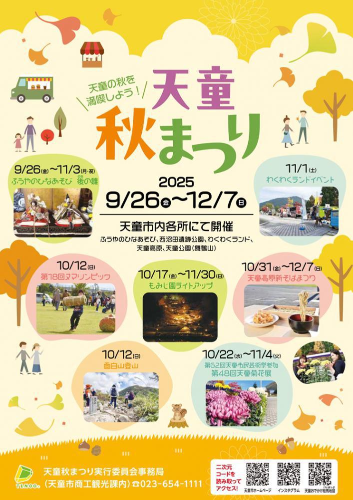 天童の秋を満喫しよう! 2025 天童秋まつり2025年9月26日(金)から12月7日(日)まで、天童市の各所で「天童秋まつり」が開催されます。幻想的な紅葉のライトアップや、採れたてのそばに舌鼓を打つ新そばまつり、天童市内各所で秋の魅力をたっぷり詰め込んだイベントが目白押しです。この秋は、ご家族や友人と一緒に天童の魅力を満喫しませんか? 開催概要 開催期間2025年9月26日(金) 〜 12月7日(日) 開催場所天童市内各所 (天童公園、道の駅天童温泉、天童高原、西沼田遺跡公園 ほか) お問い合わせ天童秋まつり実行委員会事務局(天童市商工観光課内)くわしい内容は 天童秋まつりHP電話: 023-654-1111 注目のイベント一覧 もみじ園ライトアップ期間:10月17日(金) 〜 11月30日(日)場所:天童公園もみじ園(舞鶴山)紅葉で彩られた園内が幻想的にライトアップされます。昼間とは違う、ロマンチックな雰囲気をお楽しみください。 天童高原新そばまつり期間:10月31日(金) 〜 12月7日(日)場所:天童高原天童高原産のそば「でわかおり」を使用した、香り高い新そばを味わえます。 採れたて、挽きたて、打ちたて、茹でたての「四たて」そばをぜひご賞味ください。 第18回 ヌマリンピック日時:10月12日(日)場所:天童市西沼田遺跡公園米俵を担いで走る「田力競走」など、古代の競技を体験できるユニークな運動会です。 子どもも大人も夢中になれるイベントです。 第48回 天童菊花展期間:10月22日(水) 〜 11月4日(火)場所:道の駅天童温泉 わくわくランド愛好家が丹精込めて育てた見事な菊が会場を彩ります。優雅で美しい菊の世界に触れてみませんか。 わくわくランドイベント日時:11月1日(土)場所:道の駅天童温泉 わくわくランドキッチンカーやステージイベントなど、一日中楽しめる催し物が満載です。ご家族みんなで楽しめます。 面白山登山日時:10月12日(日)場所:天童高原〜北面白山ベテランガイドの案内で、秋の面白山の自然を満喫できます。 初心者でも安心して参加できる登山イベントです。(要予約) ふうやのひなあそび 後の雛期間:9月26日(金) 〜 11月3日(月・祝)場所:ふうやのひなあそび(高橋宅)菊の節句にちなんだ、趣のあるひな人形の展示が行われます。 主要会場へのアクセス 天童公園(舞鶴山)JR天童駅から徒歩約20分。山形自動車道 山形北ICより車で約15分。 Googleマップで見る 道の駅天童温泉 わくわくランドJR天童駅から車で約5分。東北中央自動車道 天童ICより車で約10分。 Googleマップで見る