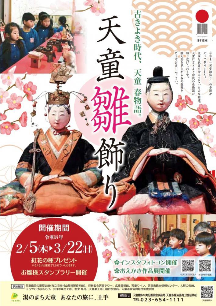 古き良き時代、天童春物語。将棋の駒の生産量日本一を誇る天童市に、今年も華やかなお雛様の季節がやってきました。令和8年2月5日(木)から3月22日(日)まで開催される「天童雛飾り」では、天童織田藩ゆかりの貴重な「古今雛(こきんびな)」や、豪華な衣装を身にまとった時代雛が市内各所でお出迎えしてくれます。見るだけでなく、食べて、遊んで楽しめるのが天童の魅力。この時期だけの「雛料理・雛菓子」や、豪華賞品が当たるスタンプラリーも同時開催!地元担当者が、効率的な巡り方やおすすめグルメを徹底ガイドします。2026年 開催概要 開催期間 令和8年2月5日(木) 〜 3月22日(日) 会場 天童市内の展示施設、旅館、飲食店など お問い合わせ 023-654-1111(天童雛飾り実行委員会) 中の人からの一口メモ今年の天童雛飾りは、市内各所にスポットが点在しています。効率よく回るなら自家用車かレンタカーがおすすめです。主要な展示施設には無料駐車場がありますが、人気店(特に「腰掛庵」さんなど)は混み合うため、午前中の早い時間の訪問が吉!また、スタンプラリーは2カ所で応募可能とハードルが低めなので、下記で紹介する展示施設(A〜F)を巡りながら、気軽に応募してみてくださいね。 歴史ある雛人形に出会う(展示施設)天童市内の博物館や資料館、観光施設で貴重な雛人形が展示されます。施設ごとにテーマが異なるので、ハシゴして見比べるのも楽しみの一つです。【A】天童織田の里歴史館(天童市立旧東村山郡役所資料館)【見どころ】いにしえより桜花爛漫へと誘う天童雛の世界をお楽しみください。 期間:2/5(木)〜3/22(日) 9:00〜17:00 (最終入館16:30) 月曜休館 (祝日・振替休日の場合は翌日) 大人220円/高110円/小中無料 20台 (バリアフリー不可) 023-653-0631【B】将棋むら天童タワー【見どころ】こけし形のお雛様は将棋の対局もできるようになっています。ティータイムでは、当店オリジナルの雛セット(お菓子と飲み物)でごゆるりとお過ごしください。 期間:3/1(日)〜3/22(日) 8:30〜17:30 (最終入館16:30) 不定休 無料 30台 (バリアフリー可) 023-653-3222【C】天童ワイン【見どころ】所蔵している古今雛を中心に展示します。酒造資料館もご覧ください。ワインの試飲もできます。 期間:2/5(木)〜3/22(日) 9:00〜16:00 (最終入館15:30) 不定休 300円 10台 (バリアフリー不可) 023-655-5151【D】天童市観光情報センター((一社)天童市観光物産協会)【見どころ】華やかな現代雛の展示や友好都市茨城県土浦市の「ゆるキャラ雛」の展示等を行います。 期間:2/5(木)〜3/22(日) 9:00〜20:00 2/16(月)・24(火)・3/16(月) 無料 400台 (バリアフリー可) 023-653-1680【E】人形の柴崎「匠の人形展」【見どころ】将棋を指す対局雛などの創作人形や、山形県産の紅花染めを用いた雛人形など、現代の人形師による匠の技をぜひご覧ください。 期間:2/5(木)〜4/5(日) 10:00〜18:00 期間中無休 無料 10台 (補助あれば可) 023-653-4246【F】ふうやのひなあそび(三日町2-4-1高橋宅)【見どころ】もと豆腐屋のふうやの明治期の古今雛、天童真田家の押絵の数々、ユニークな飾りお人形、お道具のコレクション。そして大小170対のお内裏様がお出迎え。触れて遊べるお雛様もございます。★男女ペアでご来場の先着25組様にお雛様からプレゼント! 期間:2/1(日)〜4/19(日) 9:00〜16:00 火曜日 協力金200円(中学生以下無料) 4台 (補助あれば可) 023-653-2373 ※電話連絡の上ご訪問ください 天童の春を味わう(雛料理・雛菓子)雛めぐりの合間に立ち寄りたい、期間限定の「雛メニュー」をご紹介。特にスイーツは売り切れ必至なのでお早めに。手打 水車生そば11:00〜22:00 / 不定休●雛そば 1,500円手まり寿司や三色団子がついた春らしいセット。割烹 晃月ランチ11:30〜14:00 / 不定休●雛弁当 3,300円〜※3日前まで要予約。ひな会席も承り中。腰掛庵●いちごわらび3個 990円。ぷるぷるの食感と苺の酸味が絶品。アマンデン洋菓子店●天童小町塩カステラ8個入り 1,400円。お土産に最適。梅の家●ひなもち1個 250円。可愛らしい見た目の和菓子。菓子工房 ボンむらやま●姫ケーキ5号 4,536円。お祝いの席を華やかに。 体験型!特別イベント要申込ぬいぐるみお泊まり会お気に入りのぬいぐるみが歴史館にお泊まり!どんな様子か写真に残します。 2/14(土)15:00 〜 2/15(日)15:00 天童織田の里歴史館 2日目の入館料のみ 申込:023-653-0631(歴史館)ひなのお話かみしばいお子様と一緒に楽しめる紙芝居の読み聞かせ。 3/8(日) 13:00〜13:30 広重美術館 無料要申込世界で1つのひなまつりお弁当箱づくり 3/8(日) 13:30〜14:30 広重美術館 参加無料(要持参物あり) 申込:023-654-1111(商工観光課)要申込親子でひな菓子づくり 3/15(日) 14:30〜 将棋むら天童タワー 1セット200円 申込:023-654-1111(商工観光課) お雛様スタンプラリー参加施設でスタンプを2つ集めるだけで、「お雛様グッズ」や「天童ワイン」などが当たる抽選に応募できます!さらに3つ集めると「天童温泉宿泊券」が当たる抽選に応募できます。スタンプ設置施設一覧を見る(クリックで開閉)▼対象施設(本記事で紹