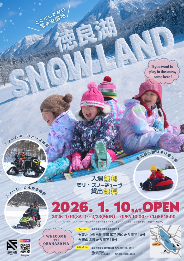 山形県内有数の豪雪地帯、尾花沢市にある「徳良湖(とくらこ)」周辺が、冬限定の雪遊び広場に変身!「徳良湖スノーランド」が2026年1月10日(土)にオープンしました。最大の特徴は、入場無料かつ、ソリなどの遊び道具もその場で無料貸し出ししてくれること。ウェアや長靴の無料レンタル(数量限定)もあり、手ぶらで訪れても、大人から子供まで思いっきり雪と触れ合えます。 開催概要 開設期間 2026年1月10日(土) 〜 2月23日(月) 開設時間 10:00 〜 15:00 場所 尾花沢市 徳良湖周辺 グラススタジオ旭前 (ナビ検索は「グラススタジオ旭」が便利です) 料金 入場無料 ※用具・ウェア貸出無料(数量限定) ※スノーモビル等のエンジン付きアクティビティは有料 ご注意雪の状況により閉鎖する場合もございます。お出かけ前に必ず公式Instagramで最新情報をご確認ください。 最新の運行状況をチェック 無料エリア・体験(用具レンタル無料)東北最大級のそり乗り場や、スキーデビューに最適なエリアなど、無料で遊べるコンテンツが充実! 東北最大級のそり乗り場そり、スノーチューブ、スノーストライダーなどの遊具がなんとすべて貸出無料!小さなお子様から大人まで楽しめます。 スキー・スノーボード雪板エリアフラットでとても易しいミニコースです。スキー場デビュー前の感覚をつかむ練習に最適!こちらも利用無料です。 スノーライダー &エアボードスリル満点の「そり付きバイク」や、うつ伏せで雪上を駆ける「エアボード」も体験できます。 「サイズアウトしたウェアありませんか?」プロジェクト皆様から寄付いただいたスノーウェア、手袋、帽子、長靴を無料でレンタルしています。(数量限定・サイズに限りあり) 有料アクティビティ(毎日営業)エンジン付きの迫力あるマシン体験!雪原を駆け巡ろう。 スノーモビル【自走体験】 8分 / 1台 1,000円雪の上を走る疾走感が最高!10歳以上の方は自分で運転できちゃいます(レクチャー合格者のみ)。約600mのコースを時間内で乗り放題。 スノーバギークルーズ【乗車体験】 20分 / 1台 3,000円スタッフが運転するバギーで雪原の中をクルーズ!アップダウンのスリルや、ふかふかの新雪歩き、写真撮影タイムも楽しめます。(2〜3名で乗車可) スノーボード・スキー初心者スクール【土日祝のみ】 1時間 3,000円ティーチングプロが教える初心者教室。ブレーキの習得やお子様の補助の仕方などを学べます。※13:00〜14:00(要予約: 070-2668-4448) イベント&周辺おすすめスポット 第5回 スノーランバイク選手権開催日:2026年2月21日(土)尾花沢雪まつり1日目に開催!2歳〜年長さんまでのお子さんが雪上で熱いレースを繰り広げます。※エントリー等の詳細は公式SNSをご確認ください。 レストラン徳良湖尾花沢牛を堪能できるレストラン。限定ランチやお子様ランチも人気! 徳良湖温泉 花笠の湯冷えた身体を芯から温める!心も身体もポカポカになる温泉です。 お問い合わせ・アクセス【現地・体験・予約に関するお問い合わせ】OBANAZAWA ACTIVE FIELDTEL: 070-2668-4448Mail: tokurako.oaf@gmail.com【その他のお問い合わせ】尾花沢市役所 商工観光課 観光物産係TEL: 0237-22-1111 ナビ設定は「グラススタジオ旭」で検索!住所:山形県尾花沢市大字二藤袋1767番地1★東北中央道 尾花沢ICから車で約10分 / 銀山温泉から車で約15分/* デザインCSS */.aikiji_honbun { padding: 0 10px; }/* ヘッダーエリア */.header-section-cyan { background: linear-gradient(135deg, #00acc1 0%, #26c6da 100%); padding: 60px 20px; border-radius: 12px; text-align: center; margin-bottom: 40px; color: #fff; box-shadow: 0 4px 10px rgba(0,0,0,0.1);}.header-content-safe { width: 100%; }.header-label-white { display: inline-block; border: 1px solid rgba(255,255,255,0.7); padding: 5px 15px; border-radius: 20px; font-size: 0.9em; letter-spacing: 2px; margin-bottom: 20px; background-color: rgba(255,255,255,0.1); font-weight: 700; font-family: 'Helvetica Neue', Helvetica, Arial, sans-serif;}.header-title-white { font-size: 2.2em; font-weight: 700; margin: 0 0 15px 0; line-height: 1.3; color: #ffffff; text-shadow: 0 2px 5px rgba(0,0,0,0.1);}.header-line-white { width: 60px; height: 4px; background-color: #fff; margin: 0 auto 20px auto; border-radius: 2px;}.header-desc-white { font-size: 1.1em; font-weight: 500; color: #e0f7fa; margin: 0;}/* 導入文 */.intro-section { text-align: left; margin-bottom: 50px; line-height: 1.9; font-size: 1.05em;}/* 見出し共通 */.section-heading { display: flex; align-items: center; font-size: 1.5em; color: #333; margin-bottom: 30px; padding-bottom: 10px; border-bottom: 3px solid;}/* アイコン位置修正 */.heading-icon { display: flex !important; align-items: center !important; justify-content: center !important; width: 45px !important; height: 45px !important; color: #fff !important; /* アイコンを白抜きに統一 */ border-radius: 50% !important; margin-right: 15px !important; flex-shrink: 0; padding-left: 4px !important; /* アイコンを右寄せ */ font-size: 0 !important; box-sizing: border-box !important;}.heading-icon i { font-size: 20px !important; line-height: 1 !important; display: block !important; margin: 0 !important; color: #fff !important; /* アイコン文字色を白に */}/* カラー定義 */.heading-icon.cyan { background: #00acc1; }.section-heading:has(.cyan) { border-bottom-color: #b2ebf2; }.heading-icon.o