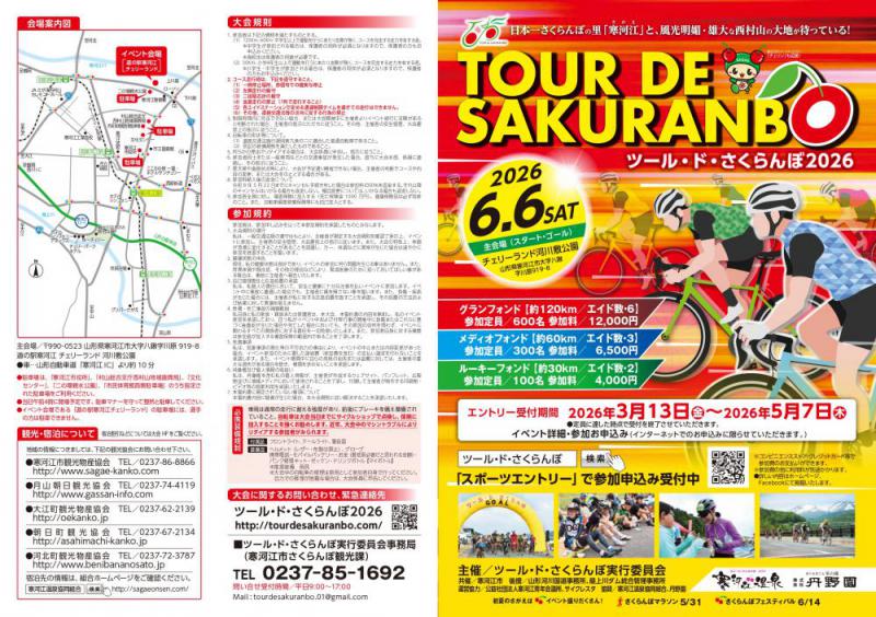 日本一さくらんぼの里を駆け抜ける!初夏のさくらんぼシーズンに合わせて開催される、大人気サイクリングイベント「ツール・ド・さくらんぼ2026」が今年も山形県寒河江市にやってきます!葉山、月山、朝日連峰といった雄大な自然と絶景を楽しみながら、各エイドステーションでは山形・西村山地域ならではのご当地グルメを堪能できる贅沢なファンライドイベント。スペシャルゲストとして自転車芸人の「団長安田」さんも参戦し、大会を盛り上げます!【イベント様子の動画】 一口メモおすすめポイント!なんと言っても一番の魅力は、各所に設けられた「エイドステーション」でのグルメ!地元ならではの特産品はもちろん、参加者全員に「さくらんぼ」または「大会オリジナルタオル」がプレゼントされる嬉しい特典も♪ 生育状況によってはさくらんぼの振る舞いもあるかも!?初夏の風を感じながら、山形の美味しいものをたっぷり満喫できる、心もお腹も満たされるイベントです! イベント開催概要 開催日 2026年 6月 6日(土) 主会場 道の駅 寒河江 チェリーランド 河川敷公園 (山形県寒河江市大字八鍬字川原 919-8) エントリー期間 2026年3月13日(金)〜5月7日(木) ※定員に達した時点で受付終了 申込方法 「スポーツエントリー」よりインターネット申込み限定 選べる3つのコース・種目体力や経験に合わせて3つのコースからお選びいただけます。いずれのコースも魅力たっぷりのエイドステーションをご用意! グランフォンド 【約115.8km / 獲得標高 1,441m】 エイド:6箇所 定員:600名 参加料:12,000円高さ日本一の噴水を横目に寒河江ダムコースを抜け、大会最高標高である大頭森山を越える本格的で走りごたえ抜群のコース! メディオフォンド 【約57.4km / 獲得標高 586m】 エイド:3箇所 定員:300名 参加料:6,500円適度なアップダウンと、大江町や朝日町の美しい自然、そして最上川との並走を楽しめるバランスの良いコース。 ルーキーフォンド 【約28.0km / 獲得標高 182m】 エイド:2箇所 定員:100名 参加料:4,000円初心者やファミリー(小学4年生以上)に最適!さくらんぼ畑や悠久の歴史を感じる「本山慈恩寺」などを巡る気軽なファンライド。 当日のスケジュール 5:30〜出走エントリー開始(7:50 グランフォンド受付締切 / 8:20 メディオ受付締切 / 8:30 ルーキー受付締切) 6:45〜開会式 7:00〜「グランフォンド」スタート 8:00〜「メディオフォンド」スタート 8:30〜「ルーキーフォンド」スタート 16:30イベント終了(完走制限時間) ※約30人ずつ3分おきに出走するウェーブスタートを採用します。 アクセス・駐車場案内 お車でのアクセス山形自動車道「寒河江 IC」より約10分 指定駐車場のご案内イベント当日は午前4時に開場予定です。以下の指定された駐車場をご利用ください。 寒河江市役所 村山総合支庁西村山地域振興局 文化センター 二の堰親水公園 市民体育館西側駐車場 イベント会場である「道の駅寒河江チェリーランド」の駐車場には、選手の方は駐車できませんのでご注意ください。お問い合わせ・大会詳細ツール・ド・さくらんぼ実行委員会事務局(寒河江市さくらんぼ観光課) 0237-85-1692受付時間: 平日 9:00〜17:00大会公式ホームページはこちら{"@context": "https://schema.org","@graph": [{"@type": "Event","name": "ツール・ド・さくらんぼ2026","startDate": "2026-06-06T07:00:00+09:00","endDate": "2026-06-06T16:30:00+09:00","eventAttendanceMode": "https://schema.org/OfflineEventAttendanceMode","eventStatus": "https://schema.org/EventScheduled","location": {"@type": "Place","name": "道の駅寒河江 チェリーランド 河川敷公園","address": {"@type": "PostalAddress","streetAddress": "大字八鍬字川原 919-8","addressLocality": "寒河江市","addressRegion": "山形県","postalCode": "990-0523","addressCountry": "JP"}},"image": ["https://yamagata-kouiki.info/assets/images/default-event.jpg"],"description": "山形県寒河江市を起点に開催される、初夏の大人気サイクリングイベント「ツール・ド・さくらんぼ2026」。絶景とご当地グルメを楽しめるファンライドイベントです。","offers": {"@type": "Offer","url": "http://tourdesakuranbo.com/","price": "4000","priceCurrency": "JPY","availability": "https://schema.org/InStock","validFrom": "2026-03-13T00:00:00+09:00"},"organizer": {"@type": "Organization","name": "ツール・ド・さくらんぼ実行委員会","url": "http://tourdesakuranbo.com/"}},{"@type": "FAQPage","mainEntity": [{"@type": "Question","name": "「ツール・ド・さくらんぼ2026」の参加方法は?","acceptedAnswer": {"@type": "Answer","text": "エントリー受付期間(2026年3月13日〜5月7日)内に、「スポーツエントリー」のウェブサイトからインターネットでお申込みいただけます。定員に達し次第受付終了となります。"}},{"@type": "Question","name": "レースのコースはどのようなものがありますか?","acceptedAnswer": {"@type": "Answer","text": "グランフォンド(約115.8km)、メディオフォンド(約57.4km)、ルーキーフォンド(約28.0km)の3コースが用意されており、体力や経験に合わせてお選びいただけます。"}},{"@type": "Question","name": "駐車場はどこを利用すればよいですか?","acceptedAnswer": {"@type": "Answer","text": "寒河江市役所、村山
