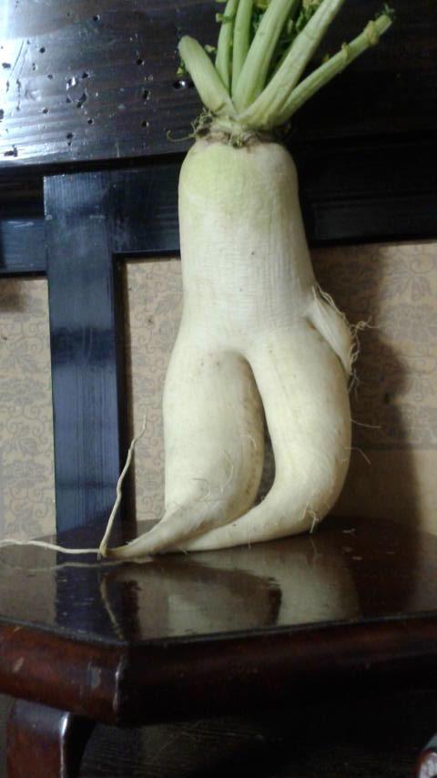 この行事が終わると、急速に暮れに向かい忙しさが増していく。もう一つの写真は、畑でとれた面白い形の大根。きざんで食べてしまうのは惜しい気がする。