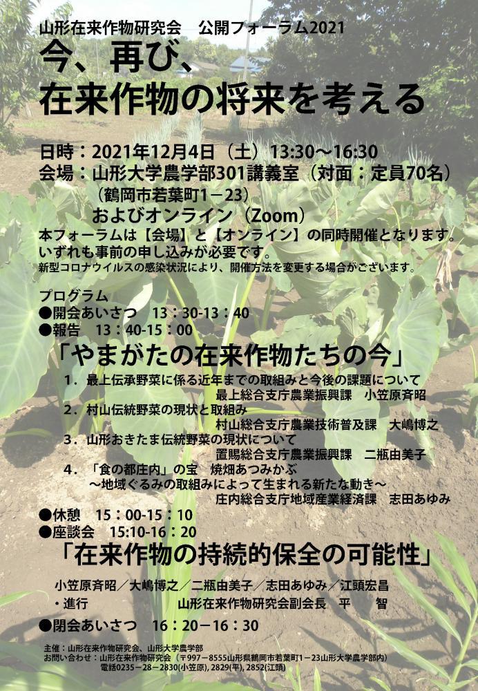 来る12月4日の午後、山形在来作物研究会公開フォーラムを対面とZoomのハイブリッドで開催します。内容は山形県の伝統野菜に関する取り組みと現状に関する報告、在来作物を取り巻く課題について話し合います。 開催まで1ヶ月を割り込んでしまいました。広報が遅くなって申し訳ありません。 参加費は無料ですが、【対面参加】(定員70名)、【オンライン参加】いずれもFaxまたはメールで事前の申し込み(12月2日締め切り)が必要です。【申込先】FAX: 0235−28−2812(事務局 小笠原あて)E-mail: nobuyosi@tds1.tr.yamagata-u.ac.jp※申し込みの際は、以下の内容とともにメールアドレスの記載をお願いします。-------〇参加方法 1と2,いずれかを選んでください1.対面で参加する 対面開催が中止となった場合オンラインで参加( する ・ しない ) 2.オンラインで参加する〇お名前(ふりがな) ○ご職業〇ご住所(〒 − ) ○TEL:〇FAX:〇メールアドレス:----------(申し込みに必要な内容、以上)オンライン参加を申し込まれた方にはフォーラム3日前までをめどにURLをお送りしますので、当日までに事前登録をお願いいたします。*オンライン参加にはパソコンまたはスマホにあらかじめZoomをインストールしておく必要があります。【対面参加の皆様へ】新型コロナウイルス感染拡大防止対策についてお願いとご注意■新型コロナウイルス感染状況によっては対面開催を中止し、オンライン開催のみとなる場合があります。対面が中止となった場合、オンライン参加希望の有無をご記入ください。■ご来場の際は、マスクの着用、玄関入口での手指消毒・検温にご協力願います。■受講申込み時に教えていただく氏名、住所、電話番号等の個人情報について、関係機関に提供する場合があります。■次のいずれかに該当する方は、ご来場をお控えください。@体調がよくない (平熱を超える発熱、咳・のどの痛み等風邪症状、だるさ、息苦しさなど)A嗅覚や味覚の異常B新型コロナウイルス感染症陽性とされた者との濃厚接触。C同居家族や身近な知人に感染が疑われる人がいる。Dフォーラム前14日以内に政府から入国制限、入国後の観察期間を必要とされている国、地域等への渡航または当該在住者との濃厚接触がある。【オンライン参加の皆様へ】■参加にはオンラインミーティングツールのZoomを使用します。お使いのパソコンやスマートフォンにZoomアプリのインストールをお願いします。セキュリティ上、最新版の利用をおすすめします。■PCをお使いの方は、Zoomダウンロードセンター(https://zoom.us/download) よりミーティング用Zoomクライアントを、スマートフォンをお使いの方は、AppStore、GooglePlayより”ZOOM Cloud Meetings”をインストールしてください。■申し込みの際には申込書にメールアドレスの記載をお願いします。オンライン参加を申し込まれた方にはフォーラム3日前までをめどにURLをお送りしますので、当日までに事前登録をお願いいたします。