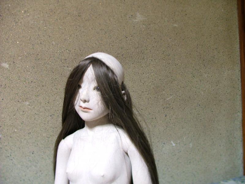 髪型に合わせて髪を貼る。この人形の場合は日本髪を結うことを想定している。