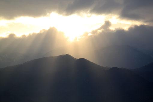 今朝は曇りでやや寒かったが、奥羽山脈から光が溢れ出して来た。