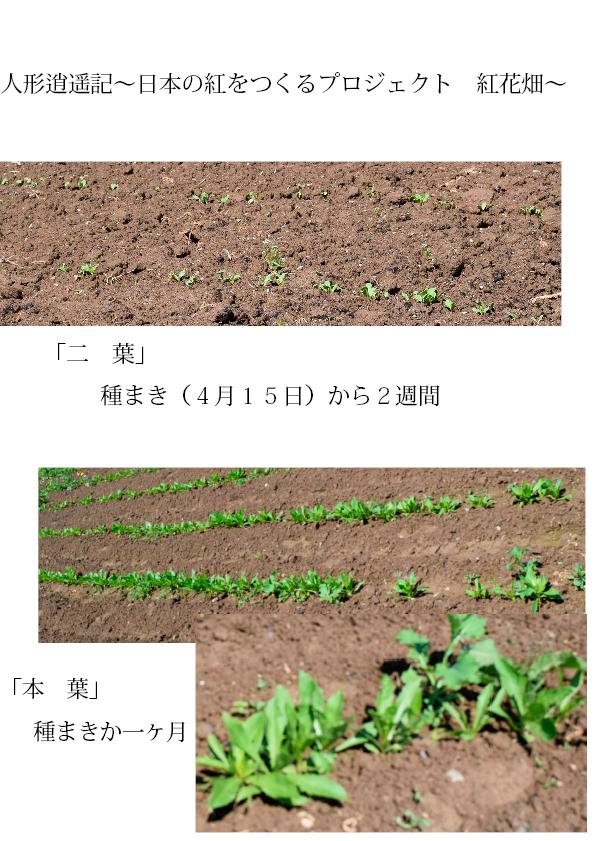 紅花の種を蒔いてから一ヶ月が経ちました。ようやく、紅花らしいギザギザの本葉に成長しています。