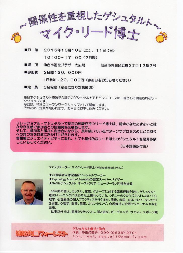 《プチくまちゃんの会》のワークショップのお知らせです。10月のアドバンスコースは、一般からも参加できるオープンコースです。サンタのおじさんのようなマイク・リード博士!昨年に引き続き、二度目の仙台です!対話型のゲシュタルト・・・普通にお話をしているうちに、不思議なゲシュタルト体験ができます?今学んでいるゲシュタルト〜〜百聞は一見にしかず、です♪一度体験してみませんか