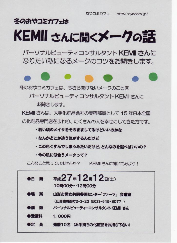 先日、冬のおやコミカフェはコラボできるかもとお話ししましたが決まりました。連絡が遅くなってごめんなさい。冬のおやコミカフェは、今さら聞けないメークのことをパーソナルビューティコンサルタントKEMIIさんにお聞きします。KEMIIさんは、国内大手化粧品会社の美容部員として15年日本全国の化粧品専門店をまわり、たくさんの人を幸せにしてきた方です。・若い頃のメイクをそのまましてるけどいいのかな・なんかどこか違う気がするんだけど ・この色くすんでしまうみたいだけど、どんなのを選べばいいの?・今の私に似合うメークって?こんなこと思っていませんか? KEMIIさんに聞いてみよう! 日時 平成27年12月12日 10時から12時場所 ファーラ会議室申込期日 12月5日まで