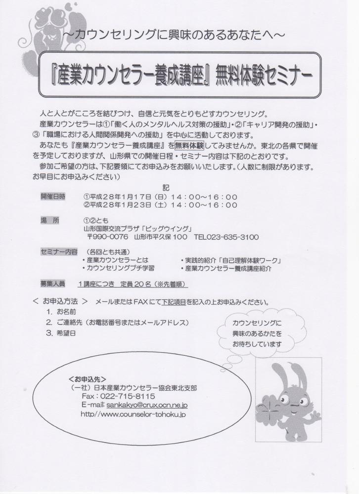 今日は、産業カウンセラー協会でやっているカウンセリング無料体験セミナーのお知らせです。カウンセリングに興味のある方、ちょっとのぞいて見てみませんか? 日時 @平成28年1月17日(日)14時〜16時 A平成28年1月23日(土)14時〜16時場所 @Aとも山形国際交流プラザ「ビッグウイング」 990-0076 山形市平久保100 内容 @Aとも ・産業カウンセラーとは・自己理解体験ワーク ・カウンセリングプチ学習 ・その他 定員 @Aとも先着20名 申し込み方法お名前・連絡先(電話・メルアド)・希望日を産業カウンセラー協会東北支部まで または おやコミ研究所まで(支部あて取り次ぎします)