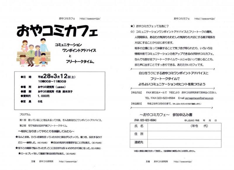 春のおやコミカフェは3月12日午前開催します。いつものように2部構成でフリートークタイムもありますよ〜〜新しい場所に不安があるあなた、話してみましょうよ 日 時 平成28年3月12日【土】 10時〜11時30分場 所 おやコミ研究所資料代 1,000円