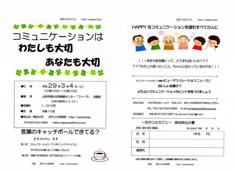 平成29年春のおやコミカフェは久しぶりにコミュニケーションは わたしも大切・あなたも大切のタイトルにしました。2月のファーラのエンパワーメント講座アサーティブなコミュニケーション術を担当させていただいてやっぱりわたしも大切・あなたも大切が基本だな〜と思ったからです。3月4日土曜日10時からです。いつものように2部構成は変わりません。参加お待ちしています。PS: エンパワーメント講座で結構身体がかたくなってしまい娘にほぐしてもらいました。言葉でなくてもわかり合えることを感じた瞬間でした。あなたもそんなときあるでしょ♪