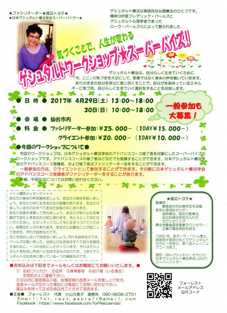 トヨ子さんが仙台でゲシュタルトのワークをやりますよ。 フォーレストさんから連絡がありました。4月の29日30日です。 心に響く言葉をくれるトヨ子さん。機会があれば、みなさんもぜひ参加してみてください。