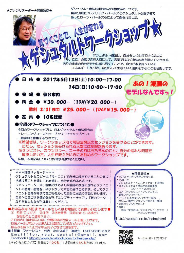 あの岡田法悦さんが仙台で、ゲシュタルトワークショップをやります。あの漫画で名前があがった岡田さん。フォーレストさんから連絡がありました。 ゲシュタルト療法学会のファシリテーターには本当にいろいろな方がいますが、アプローチの形がそれぞれ違います。それも楽しい時間なんですよ。 漫画のように劇的に変わらないまでも、大きな気づきに出会うことが出来ると思いますよ。