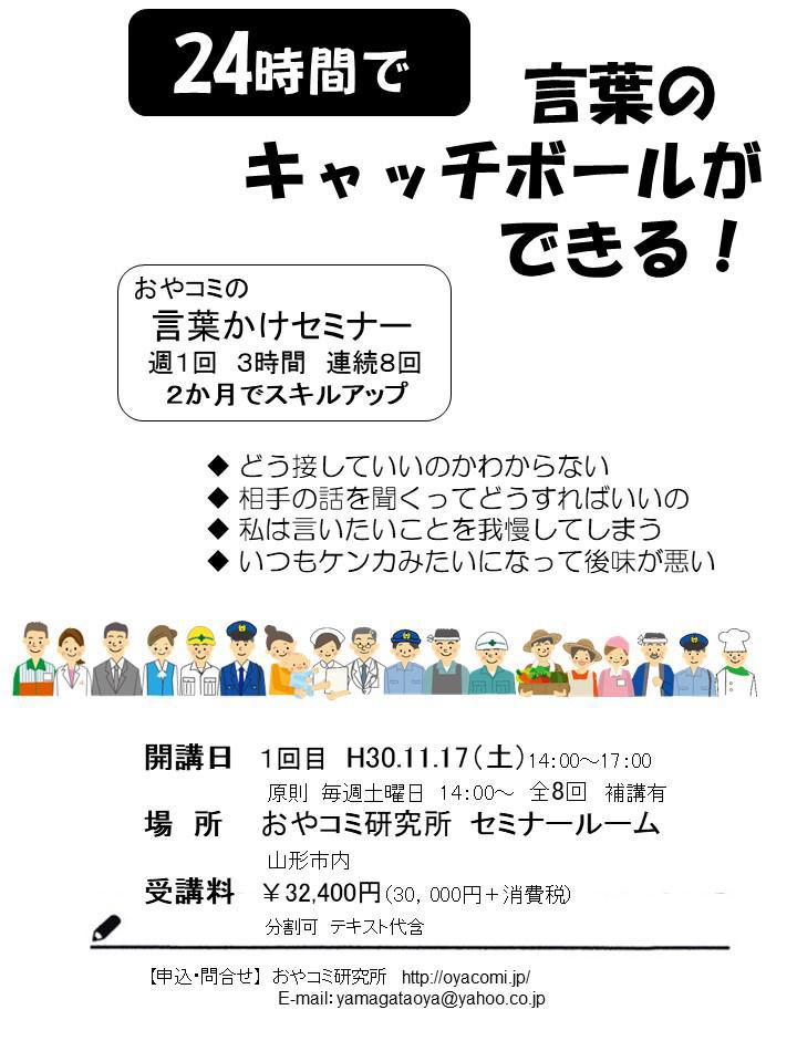 おやコミ言葉かけセミナー 開催親業のテキストを使い、おやコミ言葉かけセミナーを開催します。毎週1回3時間 全8回で学ぶセミナーです今、実際にコミュニケーションで悩んでいる方やコミュニケーションは苦手だと思っている方自分の考え方の癖や話し方を知りたい方相手とどう向き合えばいいのかなと思っている方自分自身をもっと知りたい方などなど理論だけでなく体験もあるので、ストンと身体で納得でき、日常生活でとても役に立ちます。ただのノウハウだけでない気づきが得られます。受講した方から、セルフカウンセリングのようだった、目からウロコとはこういうことか!子どもを傷つける言い方をしていたのか気づき、愕然としたよかれと思っていたことが全く的外れだった等様々な感想をいただいています。日 時 第1回目11月17日(土)14時〜17時 17日都合が悪い方は連絡ください。調整します。 原則毎週土曜日 14時からの予定ですが変更あり。 都合が悪いときは調整可能 補講あります場 所 おやコミ研究所 セミナールーム 山形市内受講料 32,400円(テキスト込み)参加の申込、お待ちしております