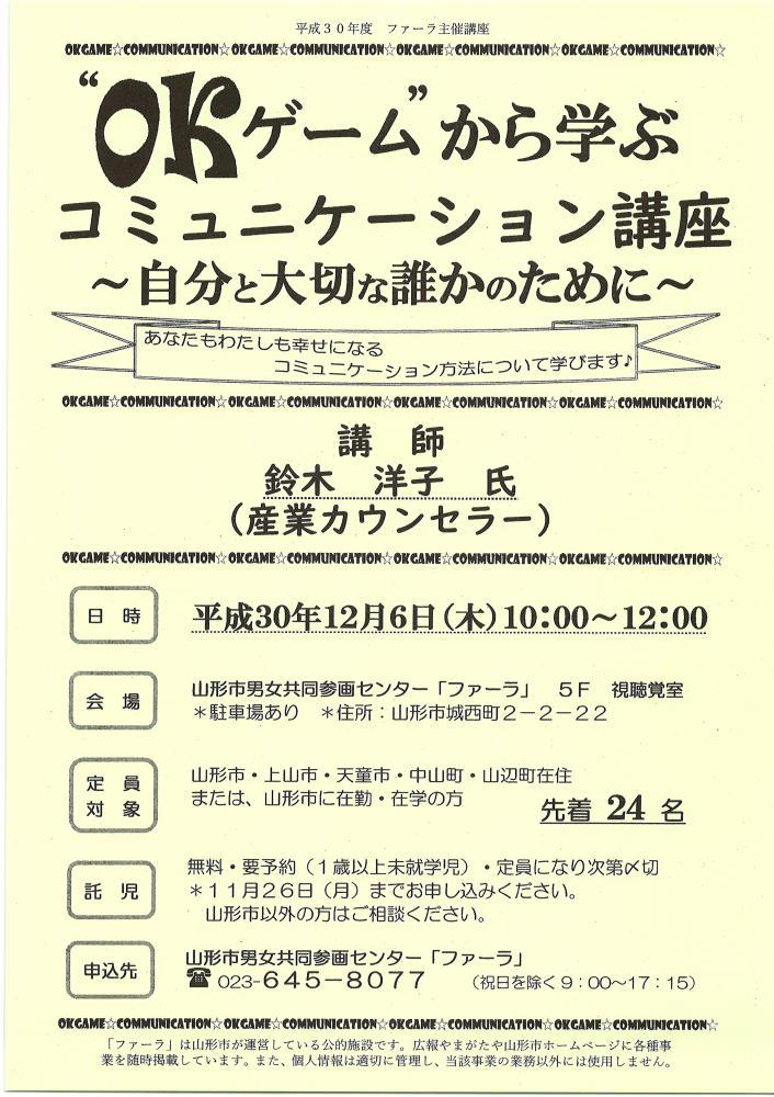 8月に、カウンセリング勉強会「紅山々」で実施して、とても楽しかったOKゲームが12月6日にファーラ主催講座として開催されます。興味がある方は、ファーラ【山形市男女共同参画センター 023-645-8077】まで申し込みを!!。OKゲームとはチェリアフェスティバル2018では本当の自分を知ると題して、自己成長エゴグラムを用い、自分はいまこういう感じなんだな、と体験していただきました。OKゲームでも、自己成長エゴグラムから、ゲームに入ります。サイコロを振って、カードで指示されたようにするだけでありのままの自分や、今まで知らなかった自分を表現したりありのままの他者を受け入れることができます。その体験を、大切な方とのコミュニケーションに活かしましょう。