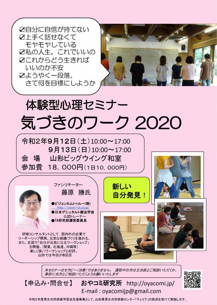 第8回目となる【気づきのワーク】開催します。体験型心理セミナーです。机での学習ではありません。自分を見つめる2日間です。新型コロナウイルス禍の中で、新しい生活様式が求められなんとなく閉塞感を感じることが増えていますちょっとしたことが心の中で大きくなって、だんだん苦しくなってくるコロナ禍の中で人との距離感がつかめない貯金も、キャリアも、出会いもない・ない・ない頑張りすぎている自分の将来が不安ただ過ぎていく毎日、こんな人生でいいのだろうかそんなことを思っている方生きづらいと思っている方自分をじっくり見つめたい方におすすめです。※3密にならないような運営を講師とも調整しており、新型コロナ感染対策として @マスク着用 A受け付け時に検温、消毒 B換気(1時間毎程度) Cソーシャルデイスタンス(2mくらい) を実施します。 日時 令和2年9月12日10時〜9月13日17時 場所 山形ビッグウイング 山形市平久保 講師 藤原 勝氏(ビジョンカムトゥルー(株)代表取締役) 問い合わせ:申し込みはHP相談窓口からどうぞ