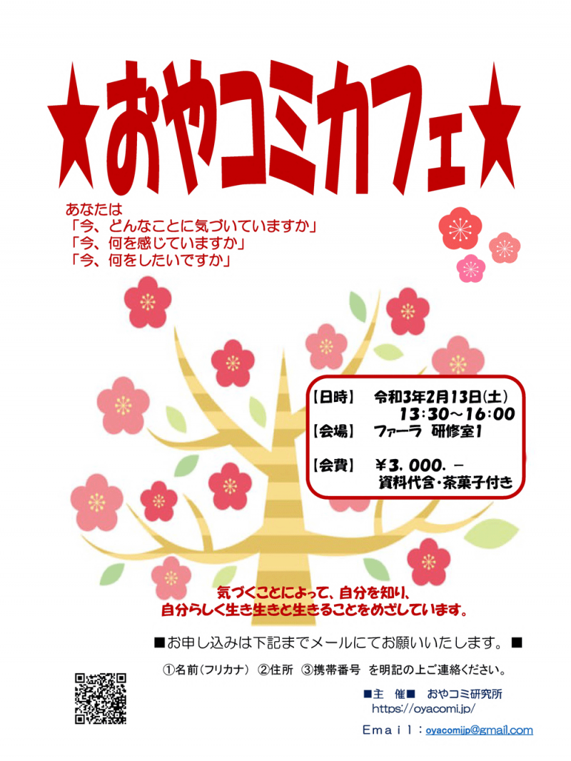 2月のおやコミカフェ、開催します。2月は会場がファーラになります。気をつけてください。気づいたこと感じていることやってみたいこと口にしてみませんか。踏み出す一歩になります!!2月13日 13時30分から16時まで山形市男女共同参画センター「ファーラ」5階 研修室1