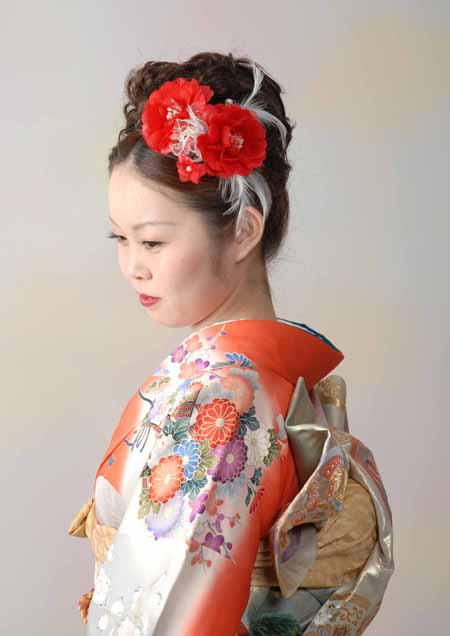 お客様ご自身の振袖(朱色)と弊店の自慢の清楚な振袖にて