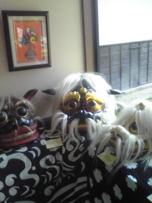 小さな美術館/やませ蔵にて渋谷正斗氏の獅子頭コレクション見ました。直後に新緑の空にて、パラソル越しにティーブレイク。
