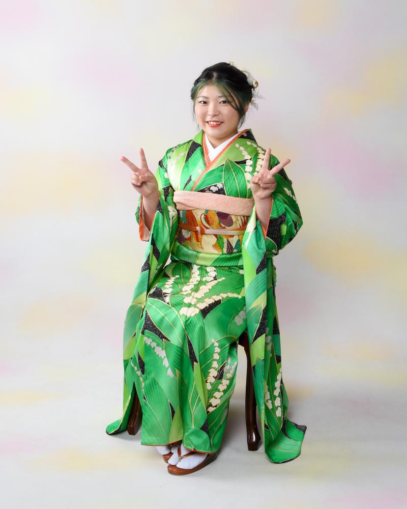 オール鈴蘭のシルク振袖。今、話題の新品の振袖を、お嬢様の寸法にフルオーダーで仕立てました。(レンタル撮影のみならば、税込11万円〜で最良のそれが着れますよ!!)