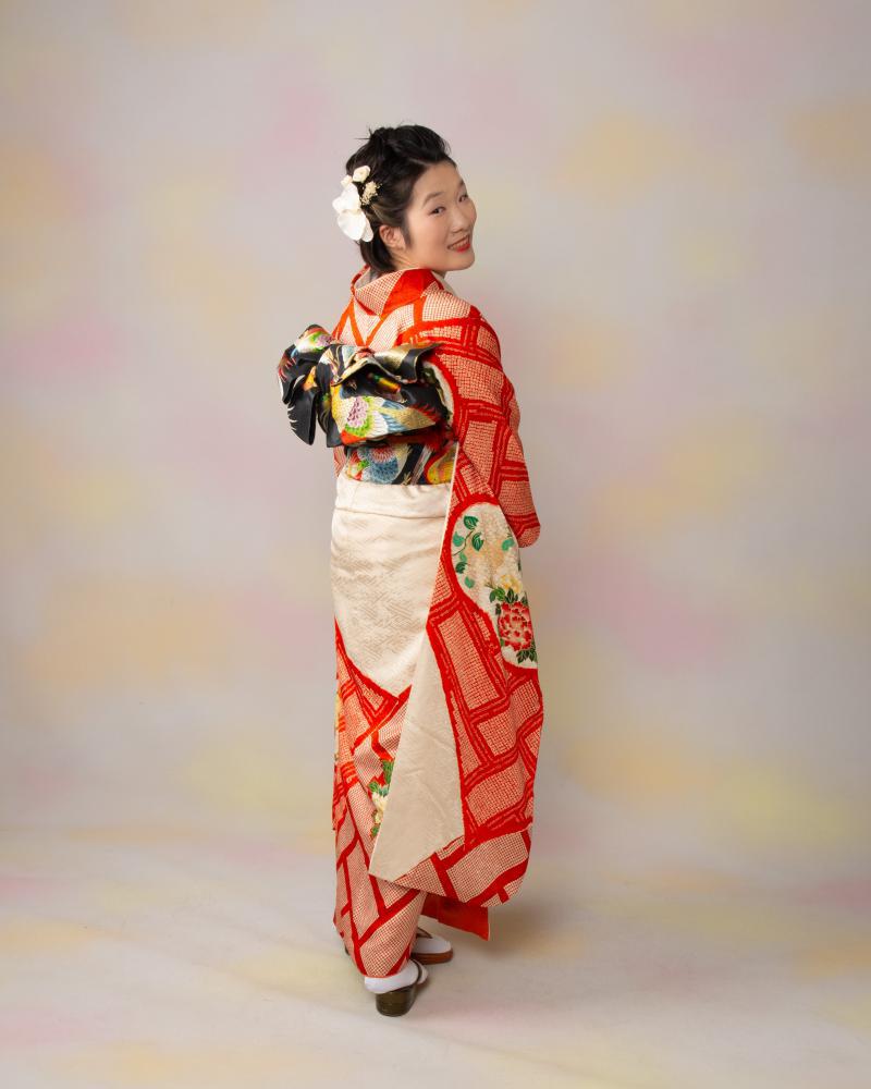 一又庭で、色々なシーンにて撮影できます。見返りの聖女は、朱白の絞りに友禅の豪華さ。瑞鳥、漆黒の西陣袋帯は、聖女の成長を願ってお母様も選定です?
