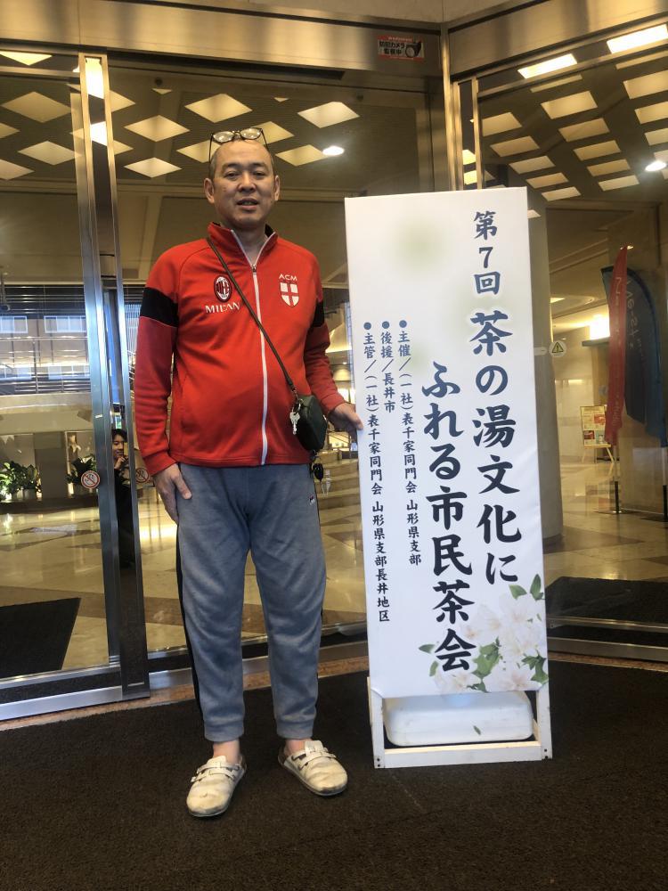 長井市白つつじ公園から、強風でタスパークホテルの9階に早朝変更。6:30から看板2枚も次男の援助で変更無事、お茶会は始まりました。・後片付けも2人で行いました!!