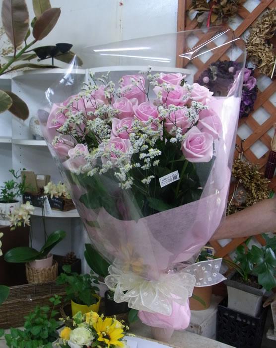 ピンクのバラのみの花束です。リボンをかわいくしてみました。