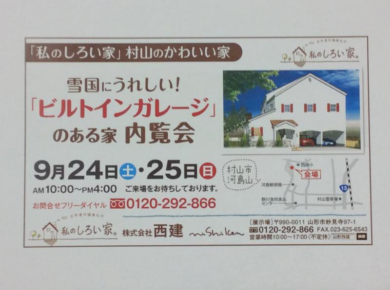 今月24日25日の土日「私のしろい家」村山の内覧会です!インナーガレージ付の雪国にうれしい住宅です。もちろん内外総しっくいの塗り壁です!ぜひご来場をお待ちしております。