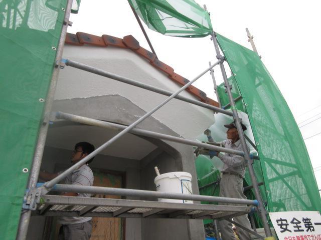 いよいよ外壁の仕上げです!真っ白いしっくい、周囲の緑の景観の中で存在感が際立ちます!!