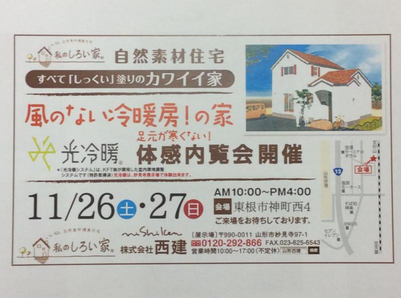 「私のしろい家」東根のかわいい家「内覧会」開催します!!11月26,27日の土日です。時間は、10時から16時。光冷暖採用の快適な住宅です。ぜひ体感にきてくださいね!