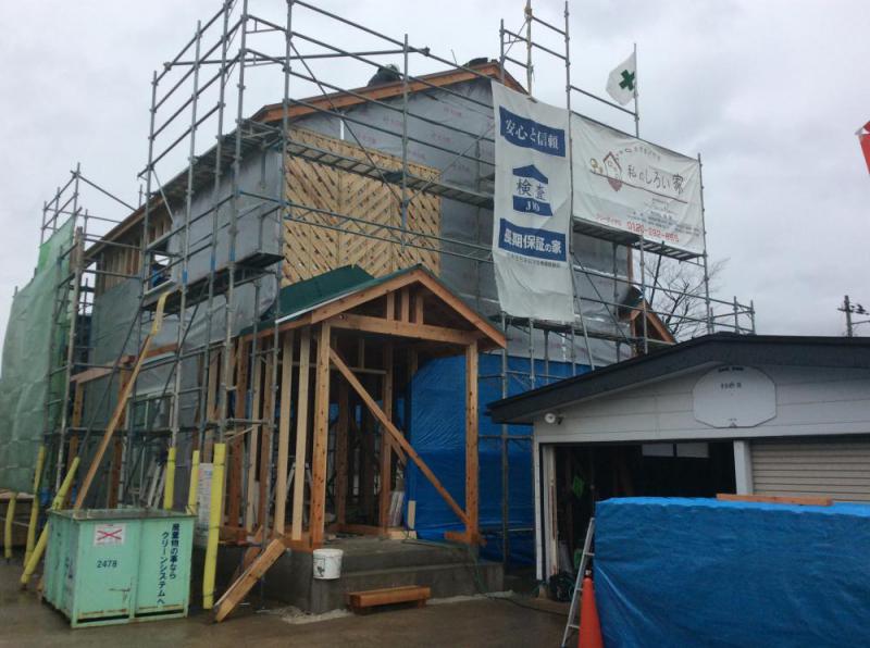 「私のしろい家」米沢 上棟しました!待ちに待った春到来を受けて、さあスタートです!米沢初の「私のしろい家」光冷暖+アミパネル通気西建工法(AVN工法)です!!快適ですよ〜!!