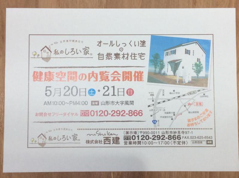山形市東北部の風間地区において「私のしろい家」 健康空間 体感内覧会を開催いたします。空気感が違う総漆喰塗と無垢材の快適空間をこの機会にご体感ください。今週20日、21日の土日 10時〜16時開催します。場所は、山寺街道 風間 の 館山郵便局の東通りです。詳しくは、木曜日の山新スウィング、またはヤマコミ5月12日号をご覧ください。ご来場をお待ちしております。お問い合わせは フリーダイヤル 0120-292-866 までお願いします。