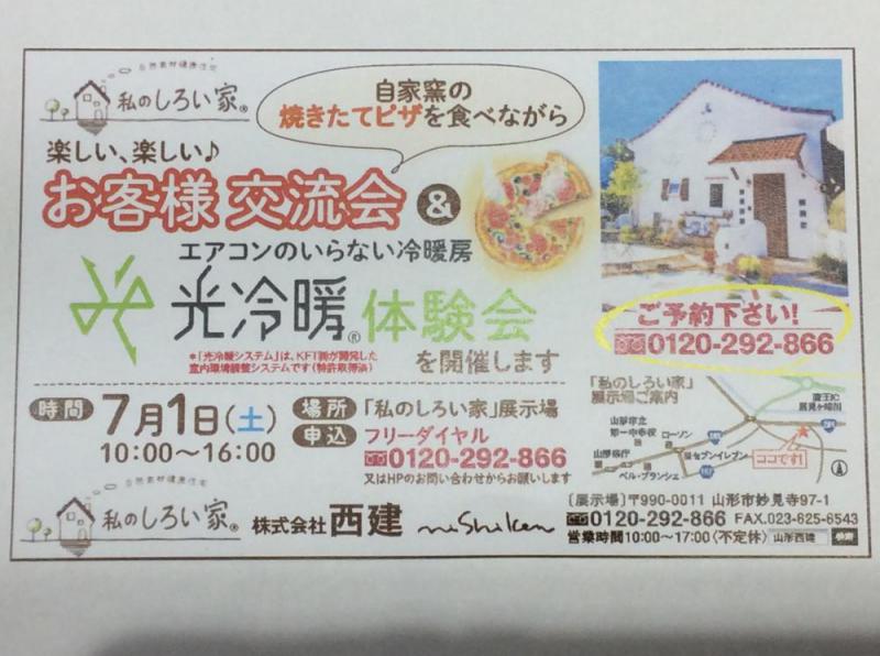 お客様交流会&光冷暖体験会を開催いたします。自家製ピザ窯で焼いた、ピザを食べながら光冷暖の、エアコンとは違う、風のない、洞窟に入ったような快適空間をご体感ください。!日時:7月1日 10時〜16時会場:「私のしろい家」妙見寺展示場(山形市妙見寺97-1)準備の都合上、ご予約ください。ご予約は、0120-292-866 までお願いします。みなさまのご参加をお待ちしております。