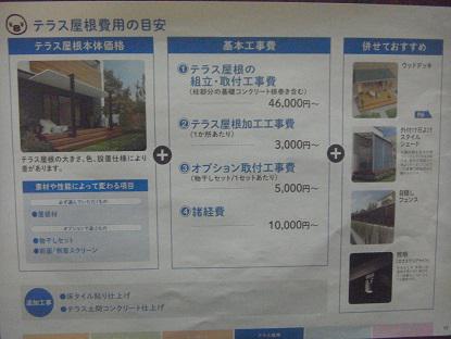 素材や性能によって変わる*テラス屋根*本体価格+組立・取付価格+オプション(ゥッドデッキ、外付け日よけスタイルシェード、目隠しフェンス、照明器具類)+諸経費という内容になります。工事内容に、柱部分の基礎コンクリート根巻き施工代金も含まれます。これ以外として、テラス土間コンクリートや床タイル貼りの工事などが、お施主様の、ご希望によって加算になります。
