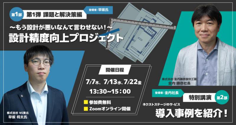 (株)NEXT STAGEさん主催のウェビナーに、弊社代表・金内と、グループ会社・NS東北の担当・早坂が出演します。設計図書が要因で現場で起こっている不備をどうやって改善するのか、そして金内設計ではどんな取り組みをしているのか。ぜひご覧ください。以下よりお申し込みください。ウェビナー申し込みはこちら■第1部:QualiZで実現する設計改善〜もう、設計が悪いなんて言わせない!〜設計精度向上プロジェクト 第1弾「課題と解決策編」■第2部:導入事例紹介特別講演 ネクストステージのサービス導入事例 開催日: 2022年7月7日(木) 2022年7月13日(水) 2022年7月22日(金) 時間:13:30〜15:00 参加費:無料 配信環境:オンライン(ZOOM)ウェビナー申し込みはこちら