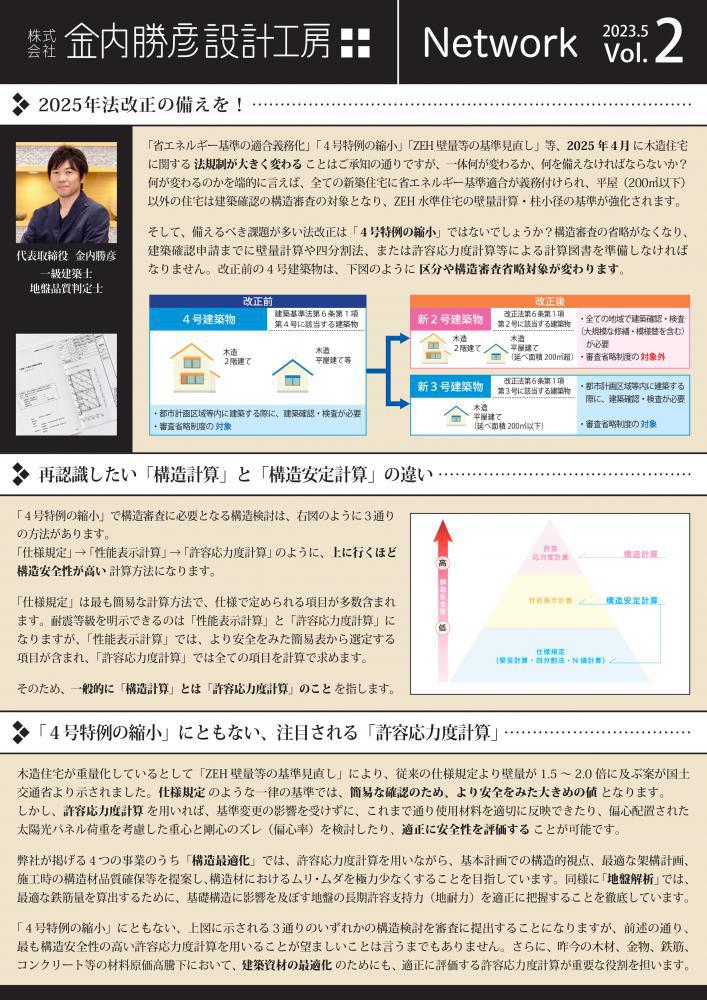 金内勝彦設計工房の情報誌『Network』Vol.2を発行しました。これまで四半期ごとに『アースレイズ山形たより』としてVol.1〜10、特別号と発行してきましたが、より多岐にわたる情報を発信・共有したいと思い、名称を『Network』に改めました。Networkには「人やモノをつないで情報や価値をお互いに共有しあっている状態」という意味があるそうです。そのように皆様とつながっていければと思い、命名しました。今回のトピックスは、◆2025年法改正の備えを!◆再認識したい「構造計算」と「構造安定計算」の違い◆「4号特例の縮小」にともない、注目される「許容応力度計算」◆「現場」と「管理」から見えてくる「着工前」の根深い課題◆「業務フロー」の整理が「根深い課題」と「4号特例の縮小」に対応する鍵になる!※詳細についてはお問合せください