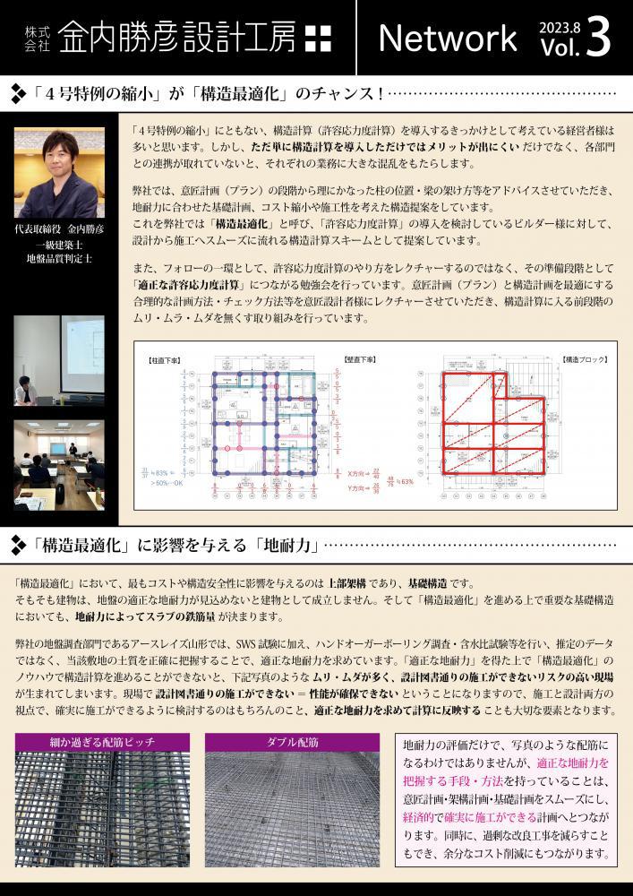 金内勝彦設計工房の情報誌『Network』Vol.3を発行しました。Networkには「人やモノをつないで情報や価値をお互いに共有しあっている状態」という意味があるそうです。そのように皆様とつながっていければと思い、命名しました。業界が今抱えている問題をどのように解決していけるか、弊社が取り組んでいることを交えながら、四半期ごとに発行しています。今回のトピックスは、◆「4号特例の縮小」が「構造最適化」のチャンス!◆「構造最適化」に影響を与える「地耐力」◆「設計スキーム」の整理が「着工前」の業務フローを円滑にする!◆「個別化エリア」と「体系化エリア」でポイントをしぼる!◆現場が欲しい「設計図書」でポイントをしぼる!※詳細についてはお問合せください
