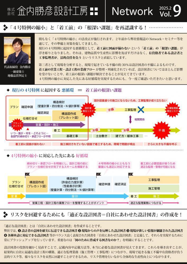 金内勝彦設計工房の情報誌『Network』Vol.9を発行しました。Networkには「人やモノをつないで情報や価値をお互いに共有しあっている状態」という意味があるそうです。そのように皆様とつながっていければと思い、命名しました。業界が今抱えている問題をどのように解決していけるか、弊社が取り組んでいることを交えながら、四半期ごとに発行しています。今回のトピックスは、◆「4号特例の縮小」と「着工前」の「根深い課題」を再認識する!◆リスクを回避するためにも「適正な設計図書=自社にあわせた設計図書」の作成を!◆「建物品質」を証明する「本質的なエビデンス」について改めて考える!◆スキーム構築の鍵は「会社として残したいエビデンス」からの逆算!※詳細についてはお問合せください