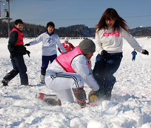 男女なかよく雪上サッカー。