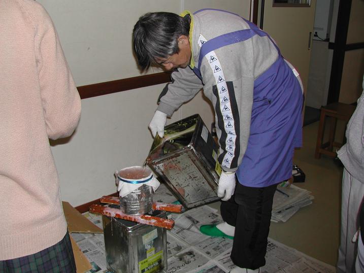 ”ろう”を溶かした一斗缶から小さな容器に分けていきます。この方は「ろうそく作りのプロ」八木先生です!先生は退職されたのですが、この日の為にわざわざ来てくださったんですよ(^^)