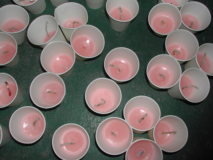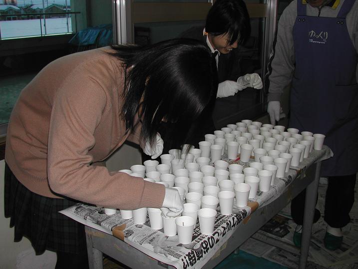 約1200個(!)の紙コップにろうを流し込み、表面が固まり始めたら”芯”を刺していきます。この加減が結構難しいんですよ。