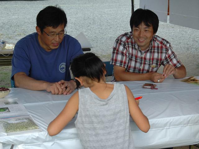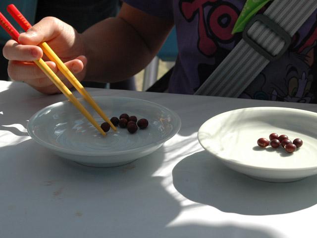 川西町の「紅大豆」と長井市の「うまのかみしめ」を使った何ともスローフードらしい箸つかみゲームです!