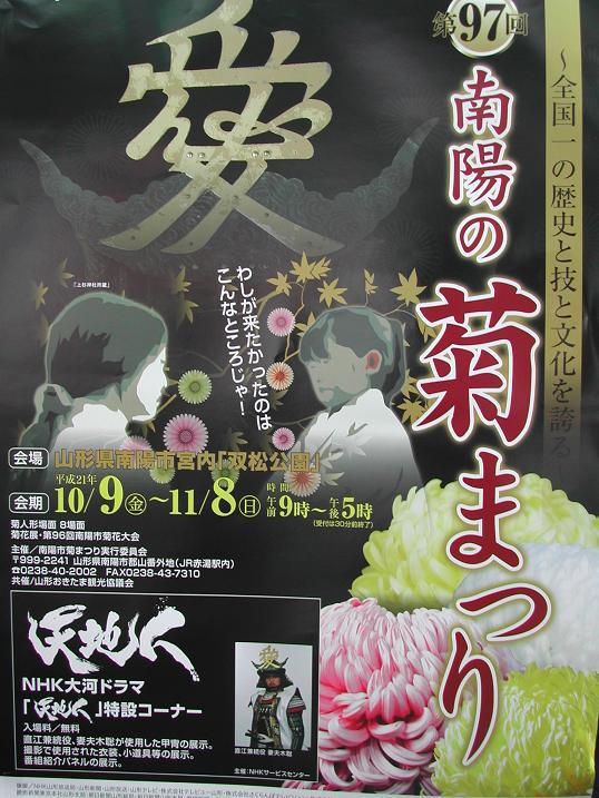 今年の菊人形のテーマは、昨年に引き続き大河ドラマ「天地人」。会場内には「天地人」特設コーナーも設けられ、ドラマで使用された衣装や小道具も展示されます。