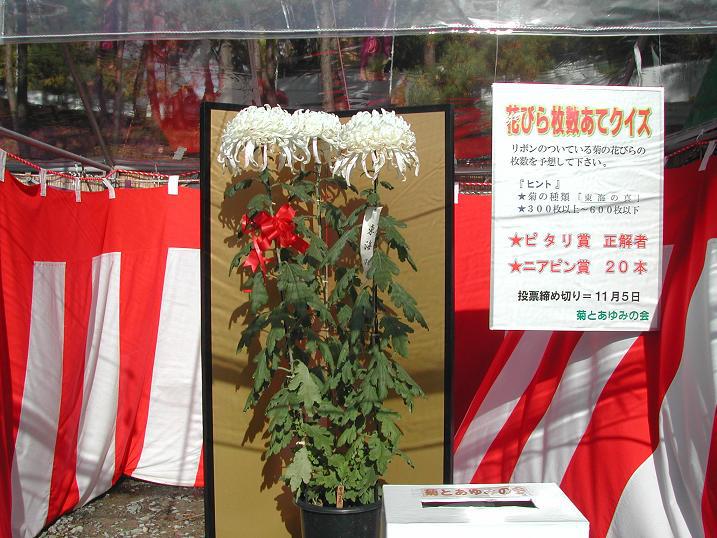 菊まつり菊花展会場に設置してある「菊の花びら当てクイズ」のコーナー。リボンの付いた菊の花びらの枚数を予想します。正解の方には豪華景品がありますので、ぜひ応募してください!