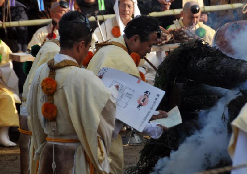 参詣者から預かった家の平面図を山伏が護摩壇の火にかざしているところです。