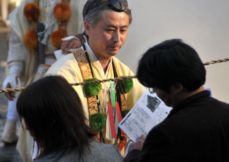 家相修正した図面を山伏が参詣者に渡しているところです。